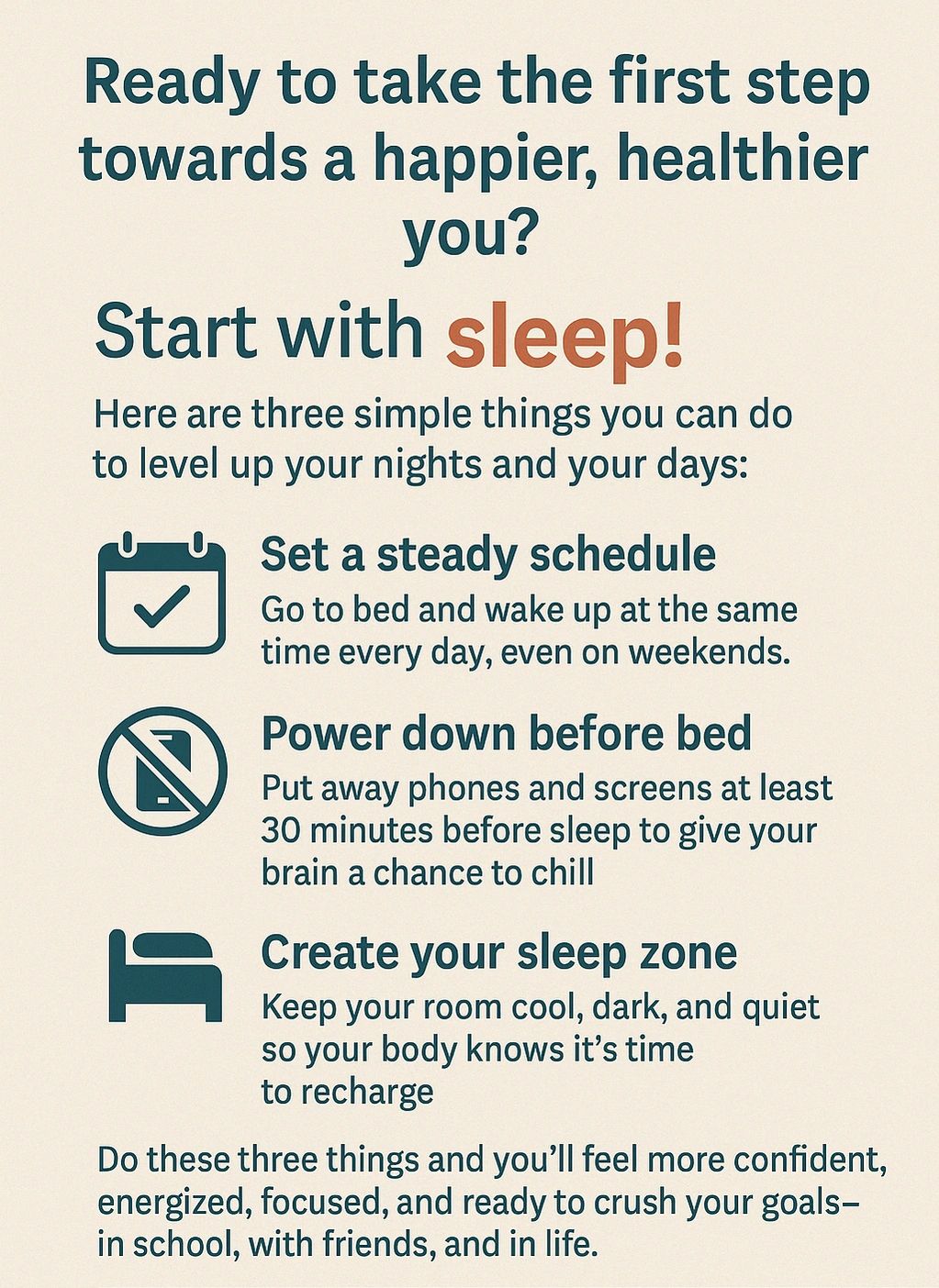 Think of sleep like your secret power-up. Getting 8–10 hours every night—and sticking to the same bedtime and wake-up time—keeps your brain sharp, your mood steady, and your body running at full strength.