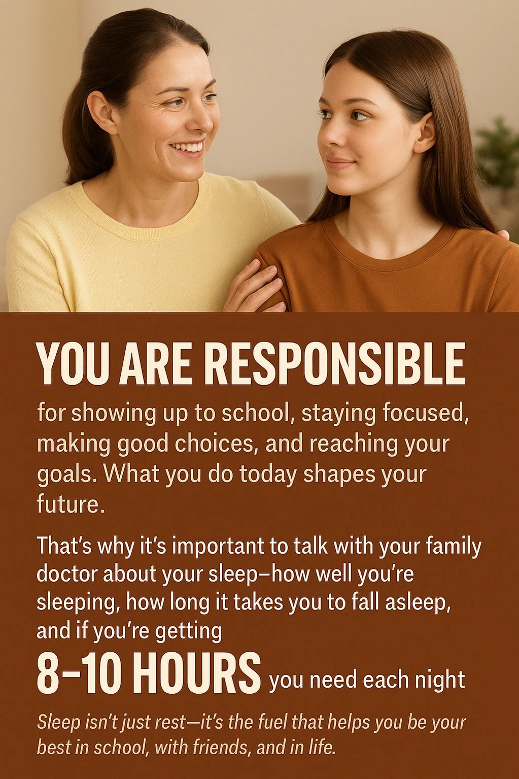 Your parent or guardian is responsible for your safety and well-being—and that includes making sure you have a healthy sleep routine. But you are responsible for showing up to school, staying focused, making good choices, and reaching your goals.